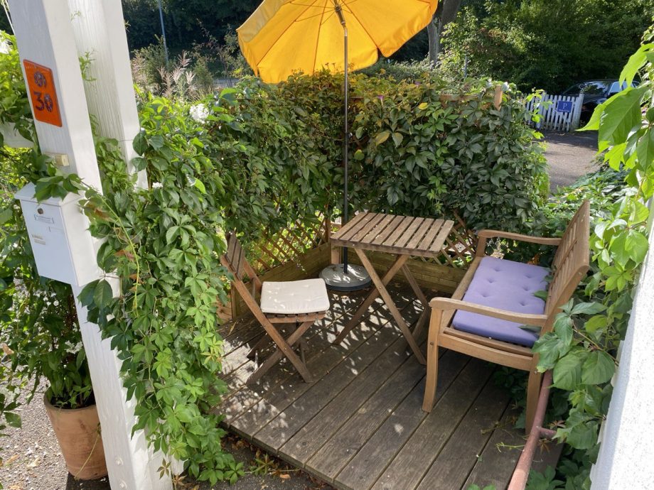 Neben dem Eingang steht eine Bank und ein kleiner Tisch, daß man seinen Kaffee auch entspannt draußen trinken kann.
