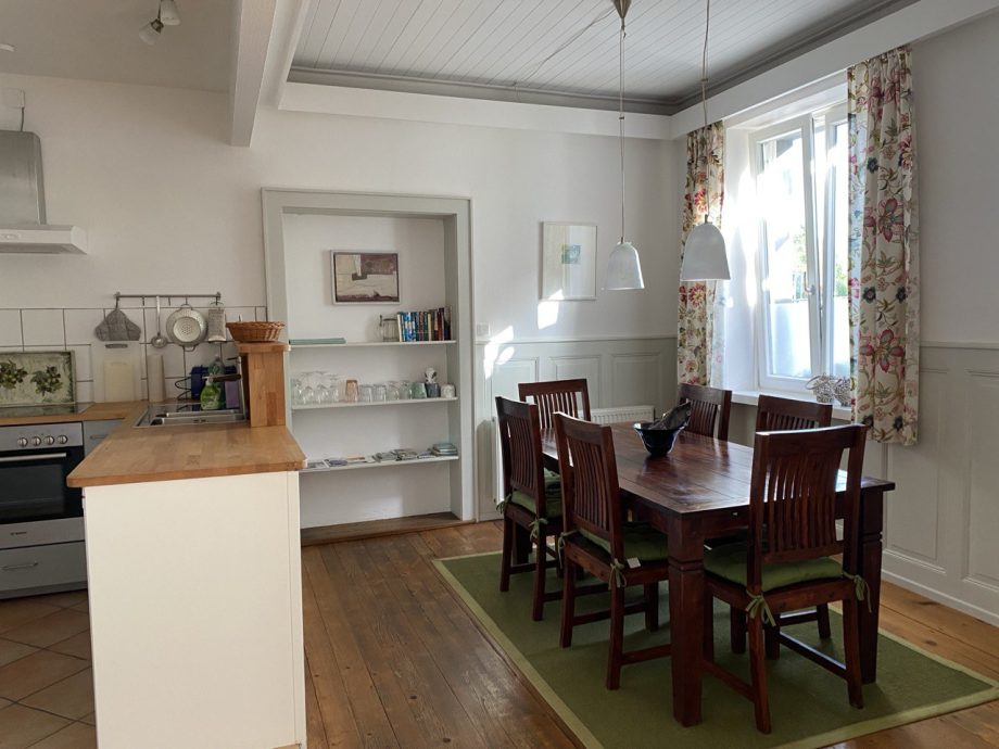 Rechts vom Eingang befindet sich der Eßbereich, mit großem Tisch und sechs Stühlen.