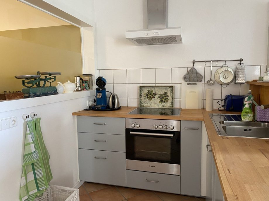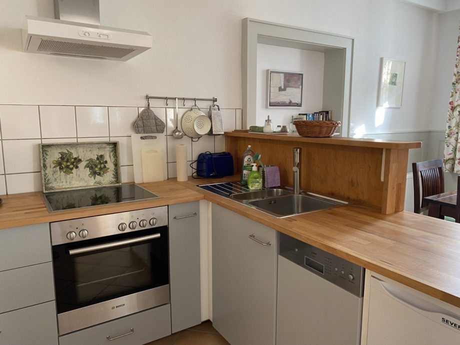 Die Einbauküche, hat eine kleine Theke mit Herd, Backofen, Spüle, Spülmaschine und Kühlschrank, incl. Eisfach. Es ist eine Senseokaffeemaschine , ein Wasserkocher und Toaster vorhanden. Basics wie Zucker, Senseotabs, Salz und Pfeffer stehen ebenfalls zur Verfügung.