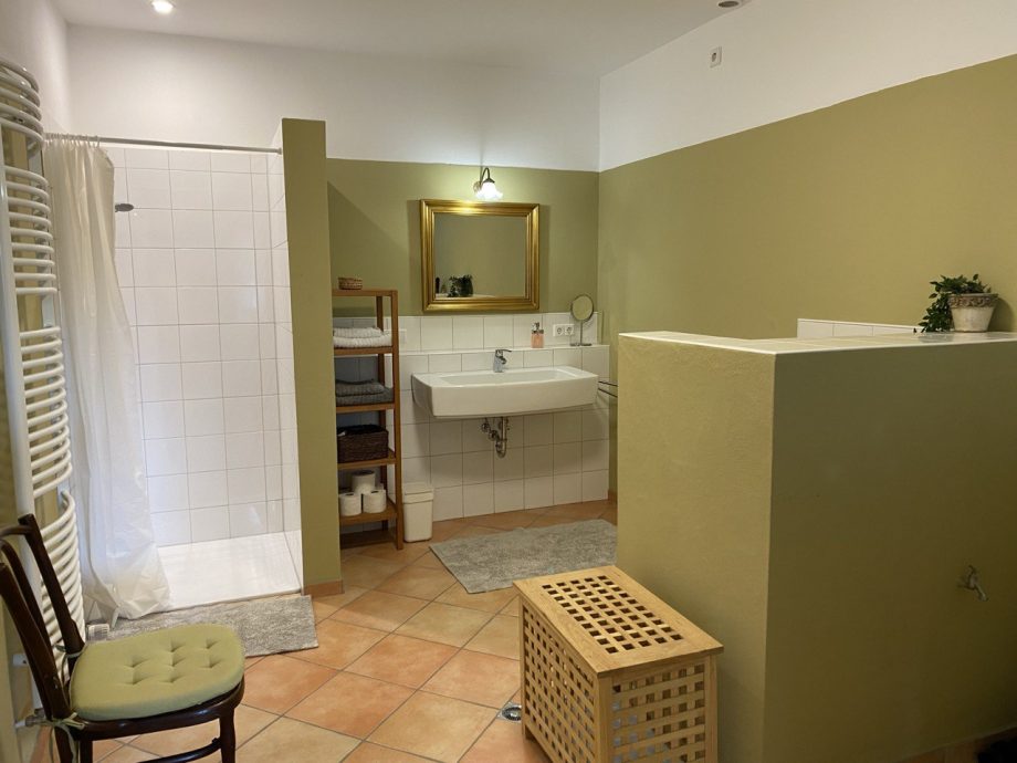 Das großzügige Badezimmer ist mit einer barrierefreien Dusche, Toilette und schönem Waschbecken ausgestattet. Haarfön und Kosmetikspiegel sind vorhanden.